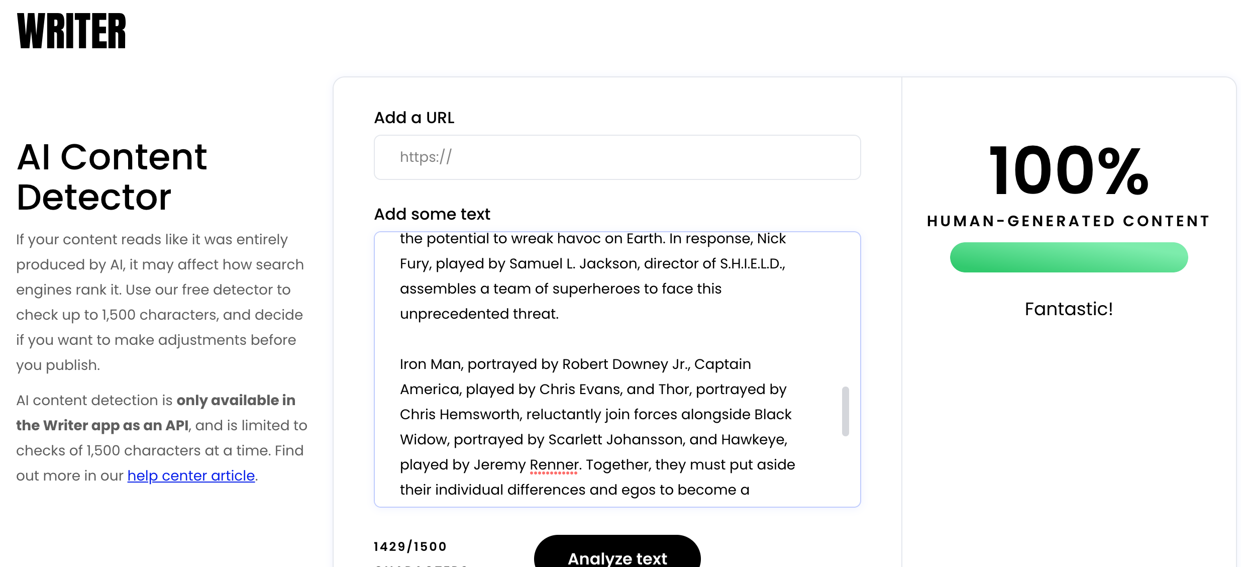 챗 지피티에서 물어본 걸 복사해서 Writer라는 사이트에 들어가서 AI에게 검사를 받습니다. 사람이 쓴 것처럼 썼는지 컴퓨터가 썼는지 구분을 하는 거죠.